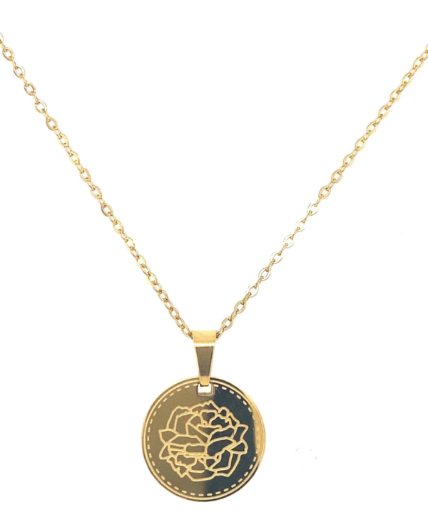 Leuke gouden Birth Flower stainless steel kettinkjes. De kettinkjes verkleuren niet en worden als cadeautje verpakt in een leuk doosje, met een bijpassend kaartje. De bijpassende sieraden kaartjes hebben leuke gouden details. Het bedeltje is ca. 20mmx15mm (Ø5mm). Het kettinkje is verstelbaar van 50cm tot 55cm. Leuk voor jezelf, of leuk om als cadeautje te geven.
