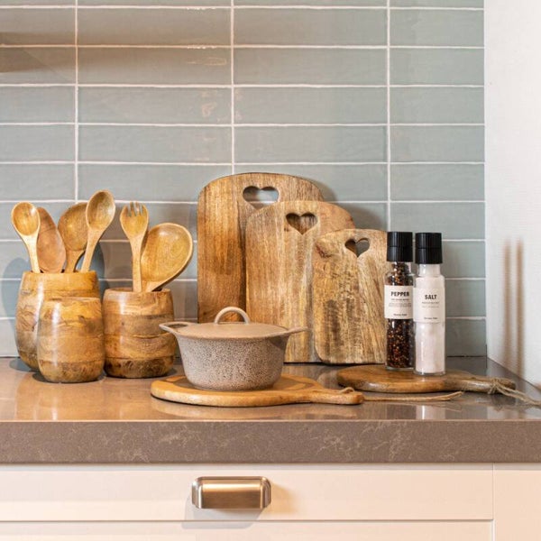 Dit is een praktische en elegante snijplank gemaakt van mangohout. De hart-vormige uitsparing geeft het een uniek en charmant uiterlijk, waardoor het ook als serveerplank kan worden gebruikt. Het hout is duurzaam en gemakkelijk schoon te maken, waardoor het ideaal is voor dagelijks gebruik in de keuken.